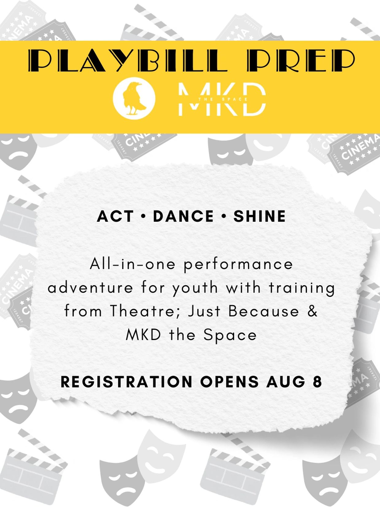 In this exciting collaborative program, Theatre; Just Because and MKD the Space team up to bring young performers a one-of-a-kind experience that blends acting, movement, and creativity. From stage presence to storytelling, your child will learn it all - and have a blast doing it!